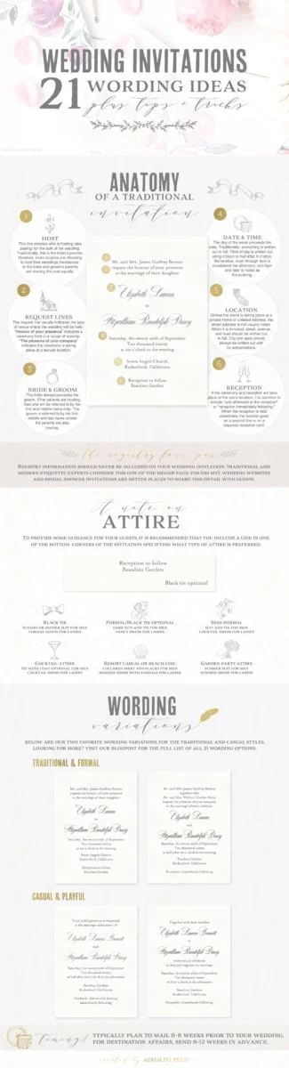 Our team of etiquette aficionados created an informative info-graphic and guide to help you navigate through and break down the different elements of an invitation and how to best word yours. In addition, we’ve also included some pro tips and tricks about the different attire options, where to include your registry link and whether you really need that extra reception card.
